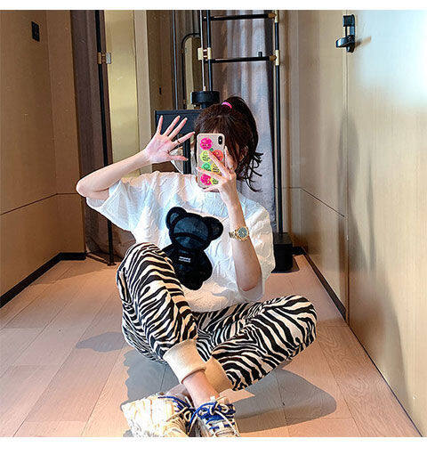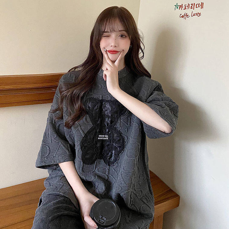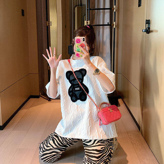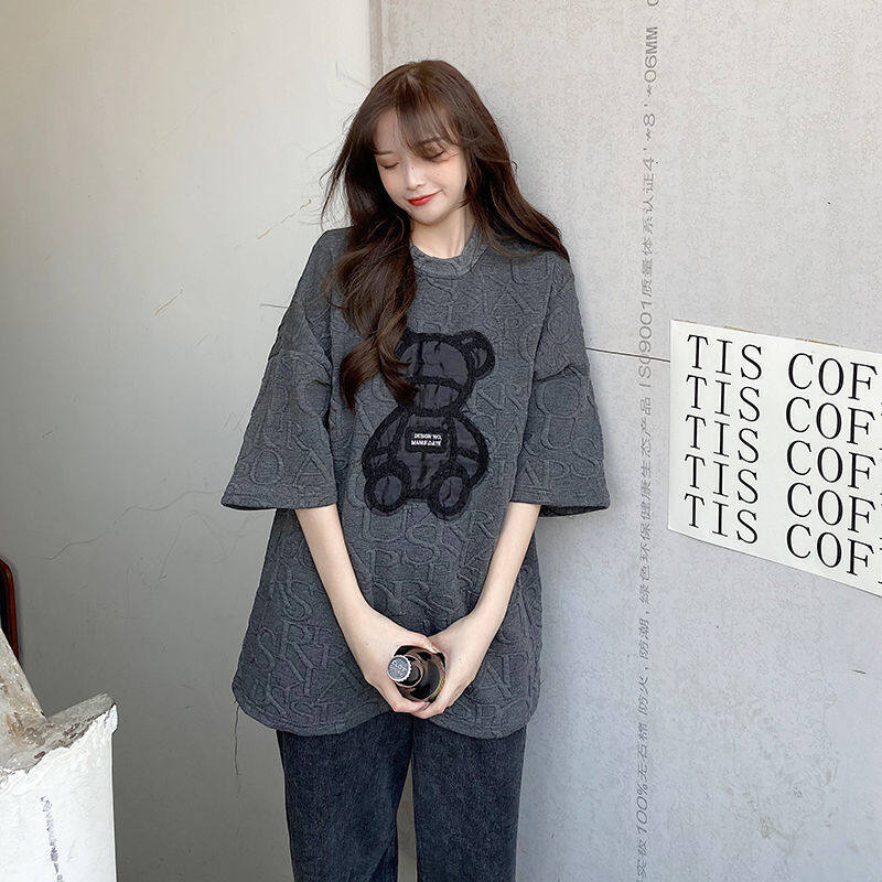 【40-80Kg】Plus size ins tshirt for women Korean version BF bear embroidery short sleeve loose all-match casual bottoming shirt