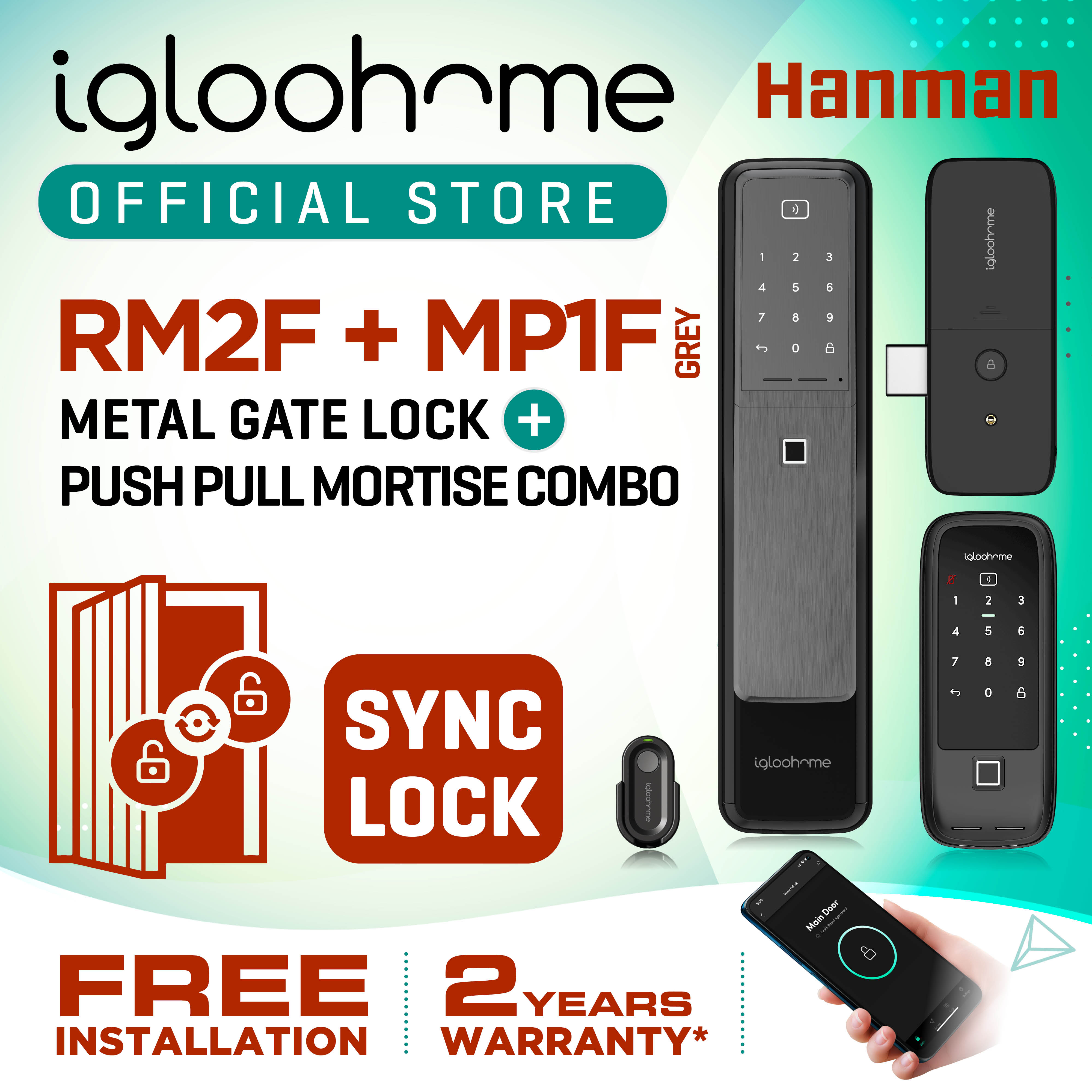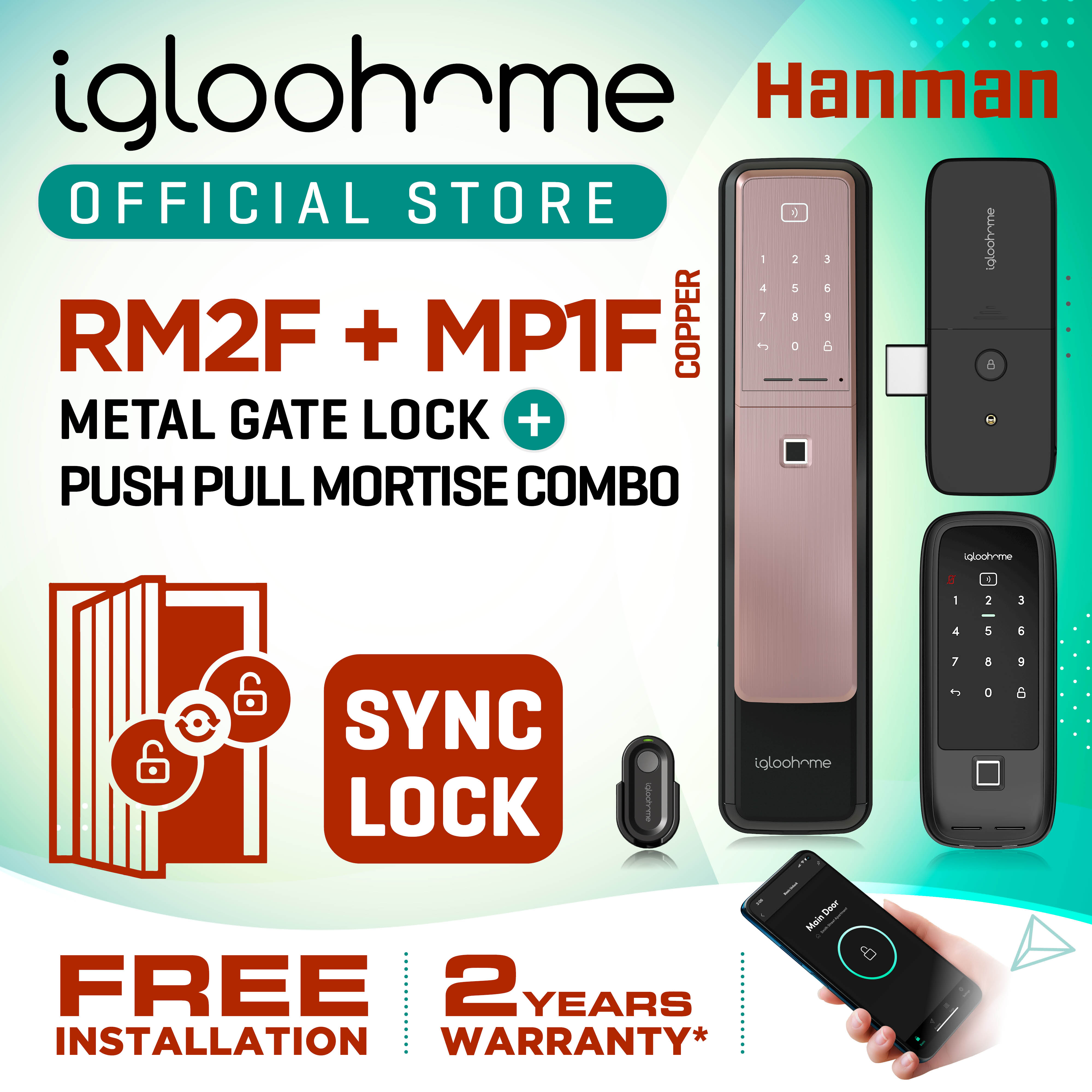 MP1F - IGLOOHOME (PUSH PULL MAIN DOOR LOCK) + RM2F - IGLOOHOME (METAL GATE LOCK) COMBO (SYNC LOCK) - FREE INSTALLATION